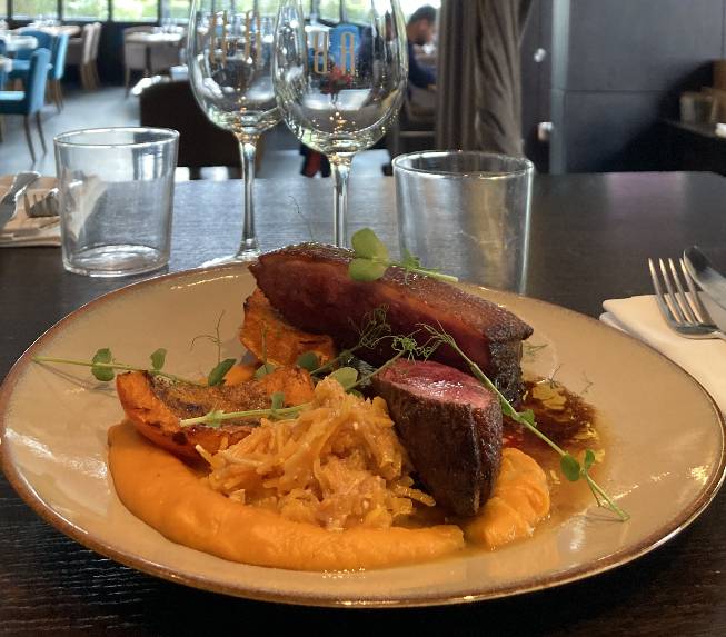 Magret de Canard accompagné d'une Courge en Trois Façons. Une harmonie parfaite entre la tendreté du magret et la douceur de la courge, une expérience culinaire qui évoque les plaisirs de l'hiver.