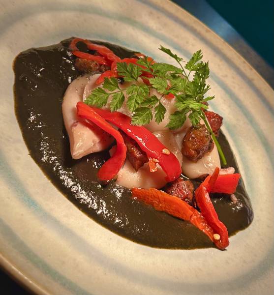 Basquaise à l'encre de seiche, piquillos et chorizo